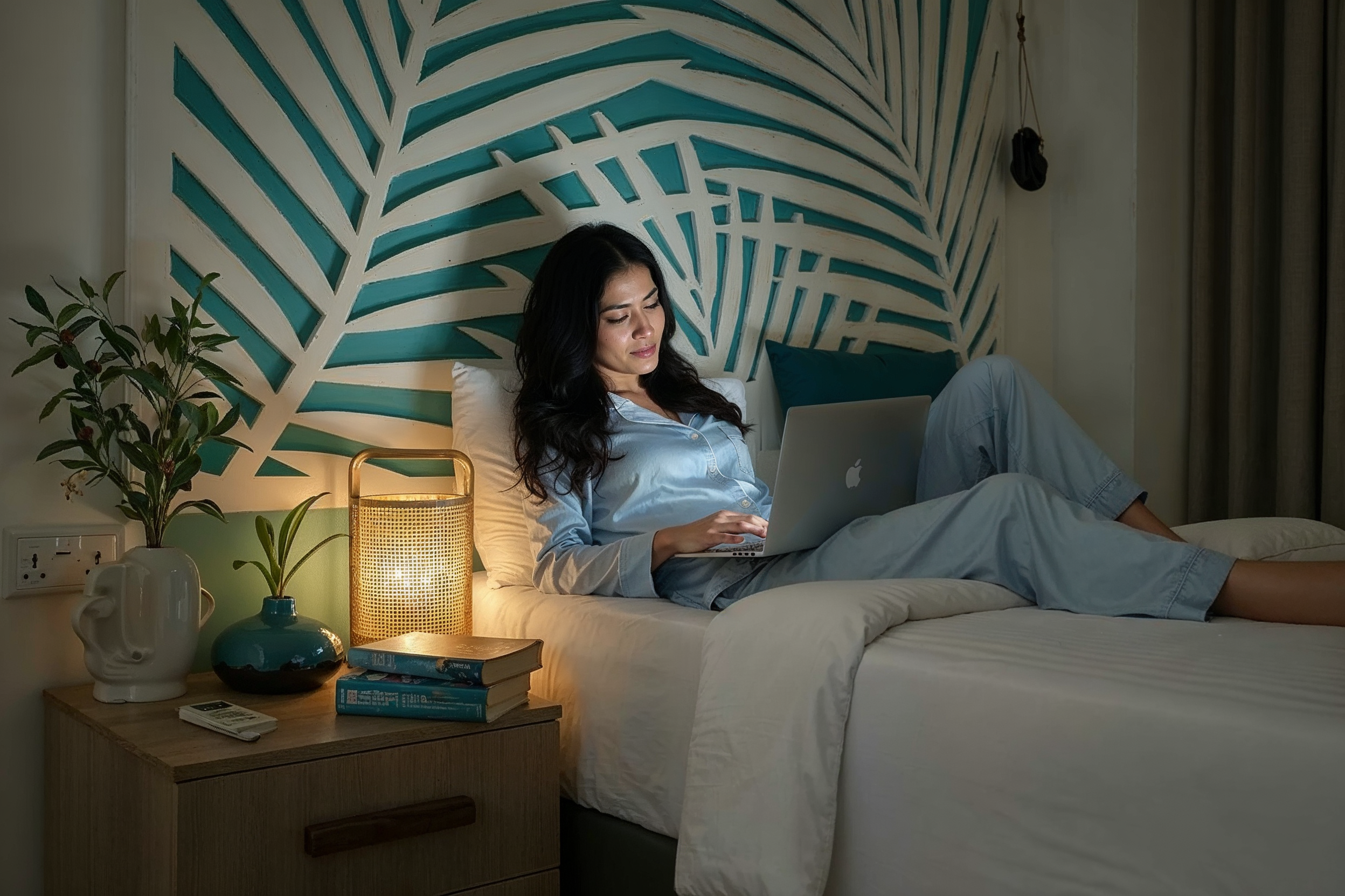 Elegant twin bed accommodation featuring our signature tropical palm artistry and modern comfort for flexible stays.